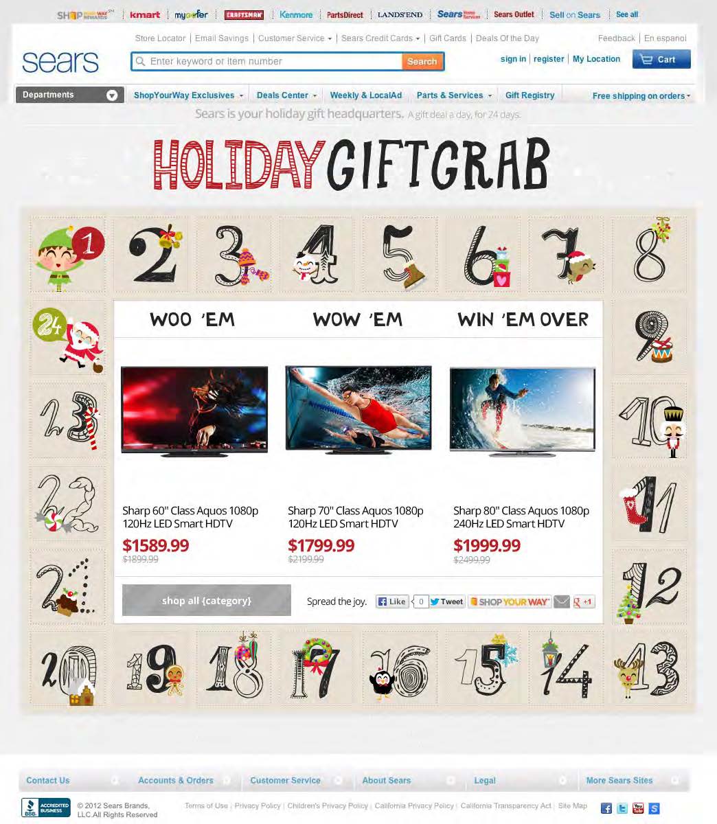 From toys to tools, clothing to kitchen appliances, Sears sells it all. As copy manager, my focus was to bring our promotions to life, from giving the Sears and Kmart homepages a brand-voice makeover to creating custom promotional experiences for global brands like Samsung, Disney, and Craftsman.